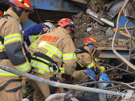 울산 남구 한국동서발전 울산화력본부 울산화력발전소 보일러 타워 붕괴사고 현장에서 소방 구조대원들이 구조 길을 트고 있다.소방청 제공"처음 구조대…