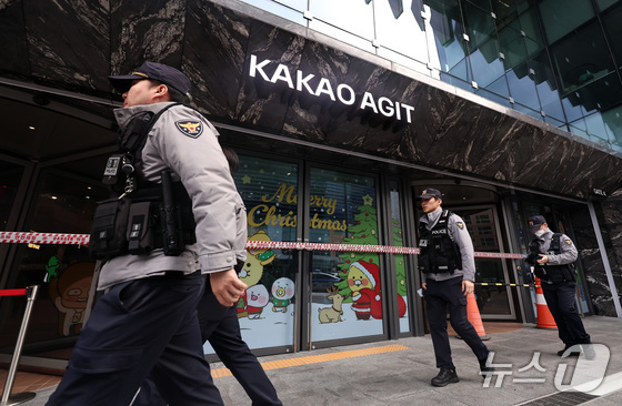 지난 15일 오후 경기 성남시 분당구 카카오 판교 아지트에서 경찰 관계자들이 건물을 통제하고 있다. 이날 카카오 사옥에 폭발물을 설치했다는 협박성 메시지가 접수돼 카카오…