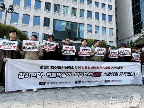 12일 서울 양천구 목동 방송미디어통신심의위원회 앞에서 전국언론노조가 김우석 방미심의위 위원의 사퇴를 촉구하는 기자회견을 진행 중인 모습. 2026.03.12 ©…