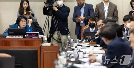 일 서울 여의도 국회에서 열린 과학기술정보방송통신위원회 한국방송공사 등에 대한 국정감사에서 최민희 위원장이 김장겸 국민의힘 의원 발언을 듣고 있다. ..…