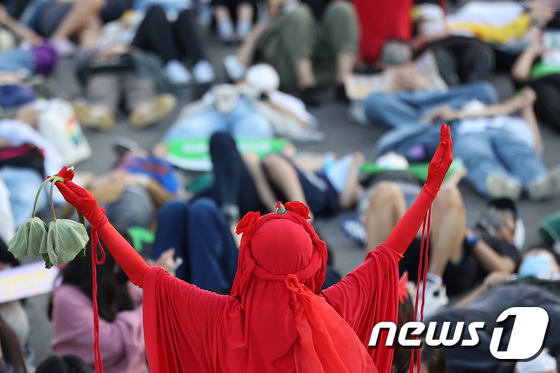 기후행진 참가자들이 서울시청 인근 세종대로에서 기후위기를 경고하며 드러눕는 다이-인Die-in 시위를 하고 있다. 2022.9.24/뉴스1 …