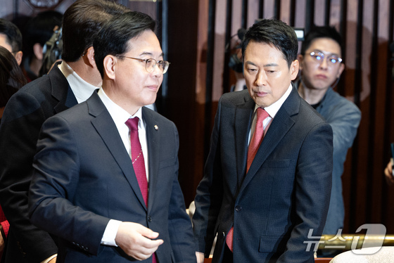 장동혁 국민의힘 대표와 송언석 원내대표가 자난 2월 24일 서울 여의도 국회에서 열린 의원총회에 참석하고 있다. 2026.2.24 뉴스1 유승관 기자…