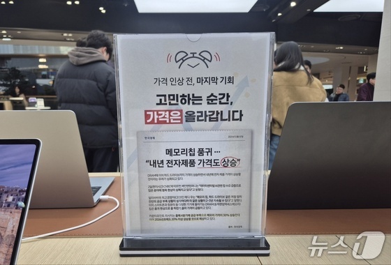 27일 서울 시내의 한 삼성스토어에 '고민하는 순간, 가격은 올라갑니다' 문구가 적힌 팻말이 붙었다. 2026.2.7/뉴스1 최동현 기자대학교 개강일을 닷새 앞둔…