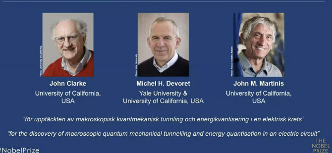 [이데일리 김현아 기자]스웨덴 왕립과학원은 존 클라크 (John Clarke·미 캘리포니아대), 미셸 드브로에 (Michel H. Devoret·미 예일대 및 캘리포니아대), 존