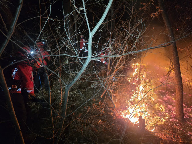 [이데일리 김기덕 기자] 산림청 중앙사고수습본부는 29일 전북 남원시 산내면 일대서 발생한 산불 진화를 위해 야간진화체제로 돌입한다고 밝혔다. 이날 오후 4시 31분 전북 남원시