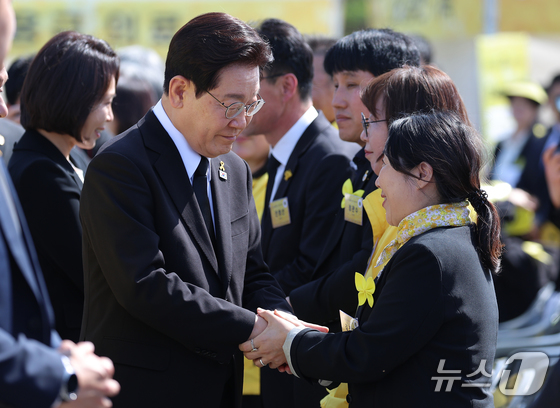 이재명 대통령이 16일 경기 안산 단원구 화랑유원지에서 열린 세월호 참사 12주기 기억식에서 유가족과 인사하고 있다. 청와대통신사진기자단 2026.4.…