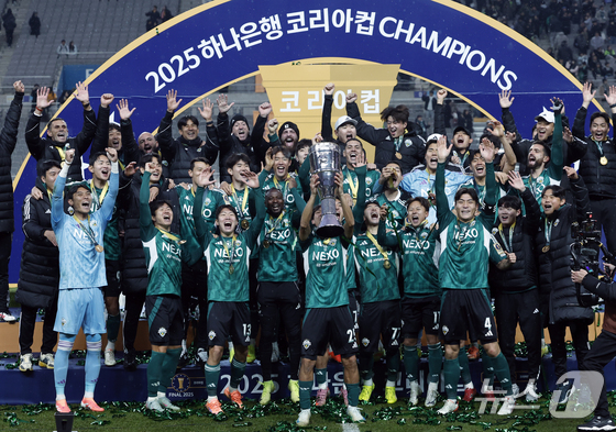 6일 오후 서울 마포구 월드컵로 서울월드컵경기장에서 열린 광주FC와 전북현대의 2025 하나은행 코리아컵 결승전에서 2대1로 승리해 우승을 차지한 전북현대 구단 레전드 …