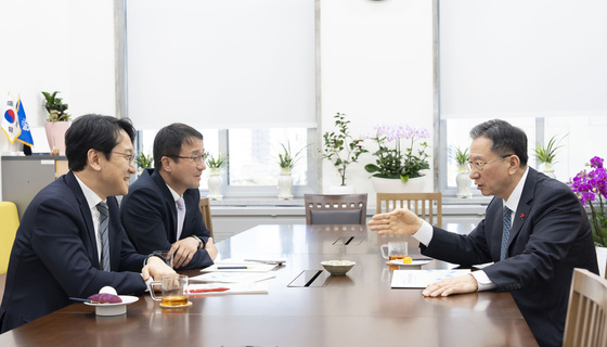 정성호 법무부 장관오른쪽이 22일 국회에서 한병도 더불어민주당 원내대표, 천준호 당 원내운영수석부대표와 만나 '민생·안전 10대 법안'에 대해 이야기하…