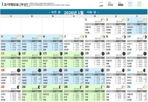 [세종=이데일리 송주오 기자] 해양수산부 국립해양조사원은 바다를 이용하는 국민이 조석 정보를 확인하고 안전하게 해양 활동을 즐길 수 있도록 ‘2026년 조석표(한국 연안)’를 발간