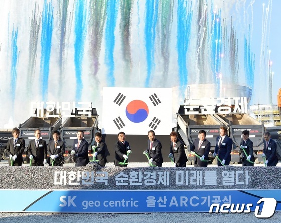 나경수 SK지오센트릭 사장, 김두겸 울산광역시장, 한덕수 국무총리, 김준 SK이노베이션 부회장, 박성민 국회의원이 15일 울산시 남구 SK이노베이션 울산콤플렉스…
