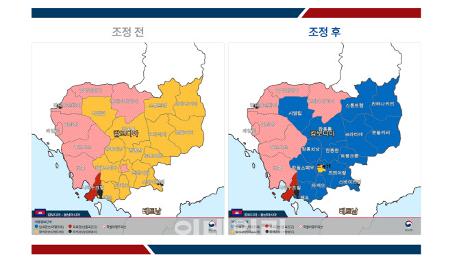 [이데일리 김인경 기자] 한국인 대상 범죄가 일어난 캄보디아 일부 지역에 대한 여행경보 수위가 하향됐다. 4일 외교부는 이날 오후 4시를 기해 캄보디아에 대한 여행경보를 조정한다고
