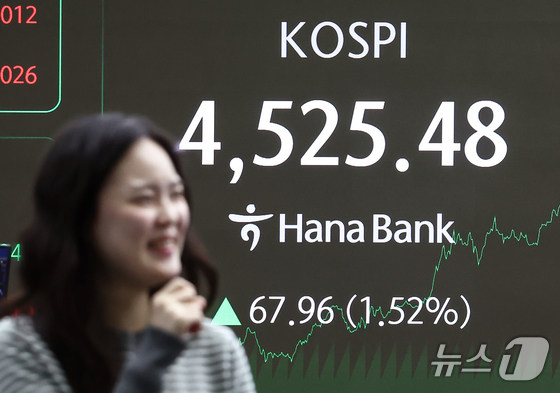 서울 중구 하나은행 딜링룸 전광판./뉴스1 News1한국투자증권은 7일 코스피 목표치를 4600포인트p에서 5650p로 상향 조정했…