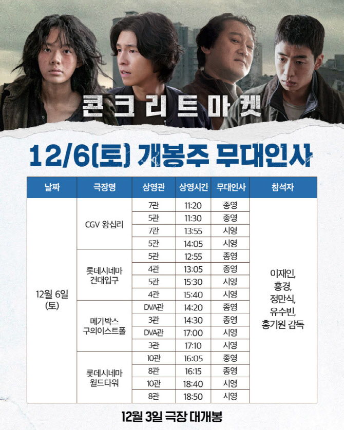 [이데일리 스타in 김보영 기자] 올겨울 가장 강렬한 몰입감과 뜨거운 에너지를를 선사할 영화 ‘콘크리트 마켓’(감독 홍기원)의 주역들이 개봉 주 주말 무대인사를 확정했다. 대지진