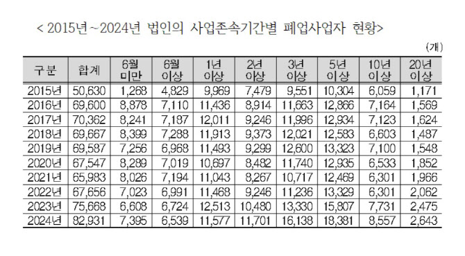 [이데일리 조용석 기자] 업력이 10년 이상된 법인의 폐업이 지난해(2024년) 역대 최대치를 기록한 것으로 나타났다. 코로나19 팬데믹은 버텼으나 장기화되는 내수침체와 산업 구조