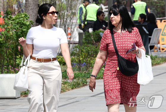 서울 낮 최고 기온이 26도까지 오르는 등 초여름 날씨가 이어지는 15일 서울 종로구 광화문광장에서 외국인 관광객이 발걸음을 옮기고 있다. 2026.4.15 …