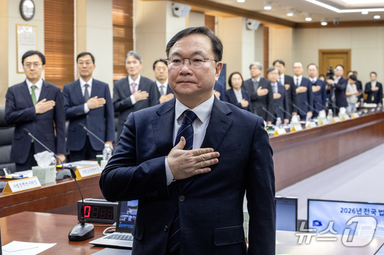 박영재 법원행정처장을 비롯한 법원장들이 25일 오후 서울 서초구 대법원 청사에서 열린 전국법원장회의에서 국민의례를 하고 있다. 공동취재 2026.2.2…