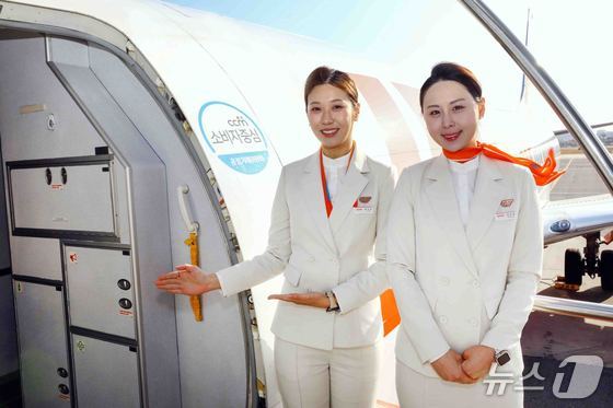소비자중심경영CCM 인증 마크가 부착된 제주항공 여객기에서 객실 승무원들이 탑승객을 맞이하는 모습자료사진. 제주항공 제공. 2025.…