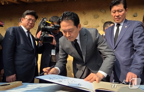 장동혁 국민의힘 대표가 25일 당 대표 취임 이후 처음으로 경북 구미 박정희 전 대통령 생가를 찾아 헌화를 마친 뒤 기념사진을 찍고 있다. 장 대표는 "한강의 기적을 이…