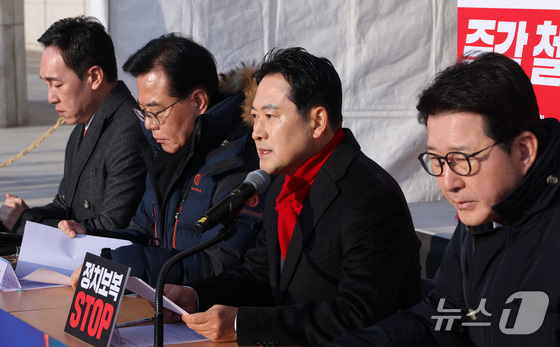 장동혁 국민의힘 대표가 15일 서울 여의도 국회 본관 앞에 마련된 천막 농성장에서 열린 최고위원회의에서 발언하고 있다. 2025.12.15/뉴스1 News…