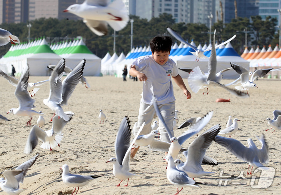 포근한 날씨를 보인 16일 부산 해운대해수욕장에서 반팔 차림을 한 어린이가 갈매기의 군무를 보며 즐거운 시간을 보내고 있다. 2026.1.16/뉴스1 New…