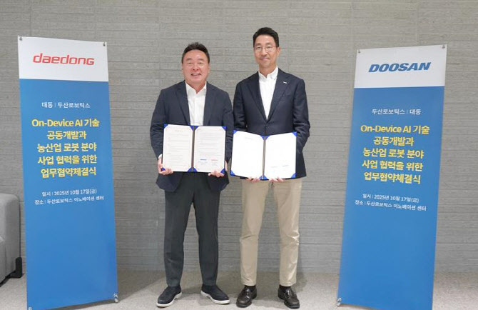 [이데일리 김성진 기자] 두산로보틱스는 미래농업 리딩 기업 대동과 ‘온디바이스 AI 기술 공동 개발 및 농산업 로봇 분야 사업 협력’을 위한 업무협약(MOU)을 체결했다고 20일