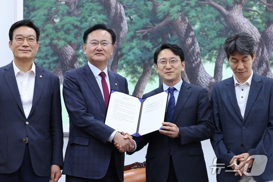 천준호 더불어민주당 원내운영수석부대표와 유상범 국민의힘 원내운영수석부대표가 17일 서울 여의도 국회에서 6.3 지방선거 정치개혁 관련 합의문을 발표하고 있다. 왼쪽부터 …