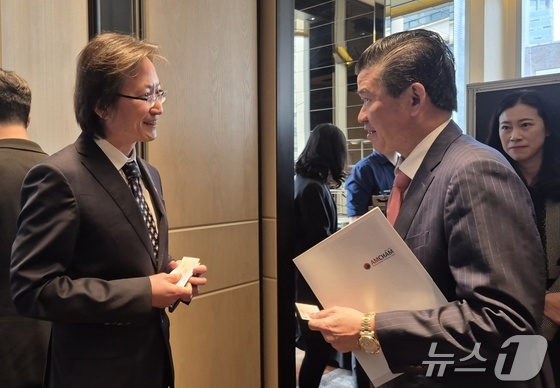 주병기 공정거래위원회 위원장왼쪽과 제임스 김 주한미국상공회의소 회장이 6일 포시즌스 호텔 서울에서 대화를 나누고 있다. 2025.11.6. 뉴스1 &c…