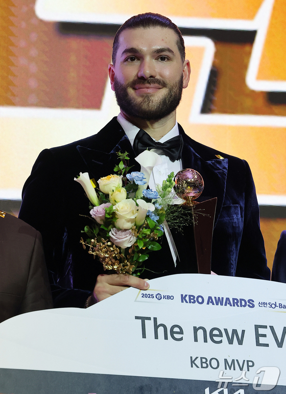 24일 오후 서울 송파구 잠실 롯데월드 호텔에서 열린 프로야구 '2025 신한 SOL 뱅크 KBO리그' 시상식에서 MVP에 선정된 한화 폰세가 기념 촬영을 하고 있다. …