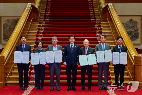 이재명 대통령이 지난 19일 청와대에서 열린 경사노위 1기 출범 맞이 노동정책 토론회를 마친 뒤 노사정 공동선언문을 든 김지형 경제사회노동위원회 위원장 등 참석자들과 기…