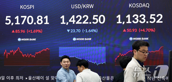 28일 오후 서울 중구 우리은행 본점 딜링룸 전광판에 증시 현황이 표시되어 있다. 이날 코스피는 전 거래일 대비 85.96p1.69% 상승한 5170.…