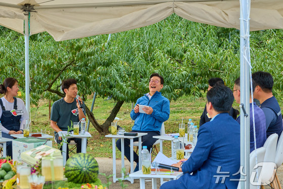 이재명 대통령이 지난 16일 세종시 전동면 조일농원에서 열린 청년 농업인 간담회에서 참석자의 발언을 들으며 미소를 짓고 있다. 이재명 대통령 SNS. 재판매 및…