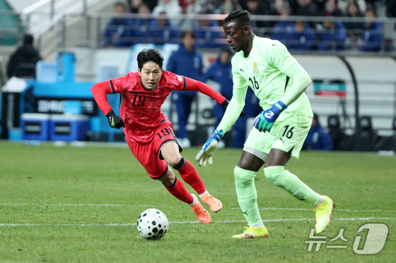 가나 골키퍼를 압박하는 이강인. 그는 경기 내내 종횡무진 뛰었다. News1 황기선 기자2025년 홍명보호의 마지막 A매치였던 가나전에서 가장 돋보였…