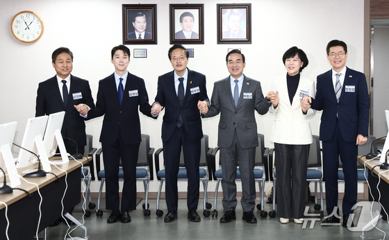 지난 23일 오전 서울 영등포구 더불어민주당 당사에서 열린 중앙당공천광리위원회 2차 회의 및 광역단체장 후보자 면접에서 서울시장 후보들이 손을 맞잡고 기념촬영을 하고 있…