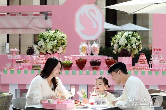 [이데일리 김태형 기자] 18일 인천 영종도 파라다이스시티에서 모델들이 딸기뷔페 팝업매장에서 기념촬영을 하고 있다. 파라다이스시티는 스와로브스키와 협업해 핑크 톤 크리스털 콘셉트의