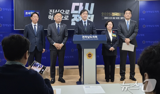 조국혁신당 당 대표에 출마한 조국 전 비대위원장이 17일 오전 전남 무안 전남도의회에서 전당대회 당 대표 및 최고위원 후보 기자회견을 하고 있다. 2025.11.17/뉴…