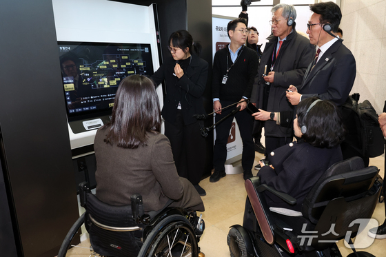 김민석 국무총리가 30일 서울 용산구 국립중앙박물관에서 열린 배리어프리 키오스크 현장간담회에 앞서 참석자들과 시설 참관을 하고 있다. 2025.12.30/뉴스1 &co…