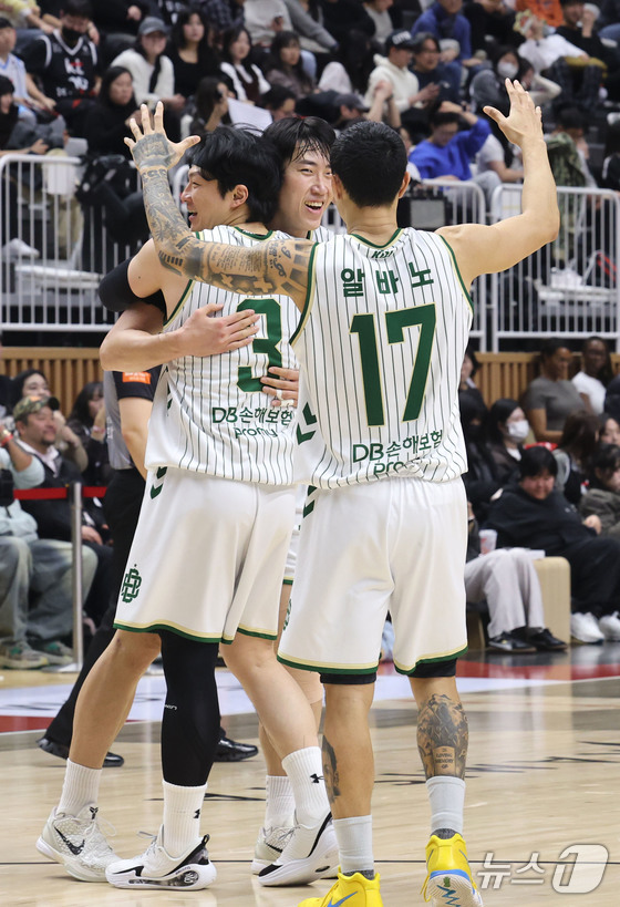 1일 오후 경기 수원KT소닉붐아레나에서 열린 2025-2026 LG전자 프로농구 수원 KT와 원주 DB의 경기에서 96대 89로 승리한 DB선수들이 기쁨을 나누고 있다.…