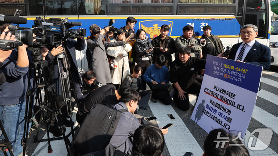 정근식 서울시교육감이 29일 오후 평화의 소녀상이 위치한 서울의 한 고등학교를 찾아 철거 집회를 예고한 우익단체를 향해 비판하고 있다. 이날 위안부법폐지국민행동 등 우익…