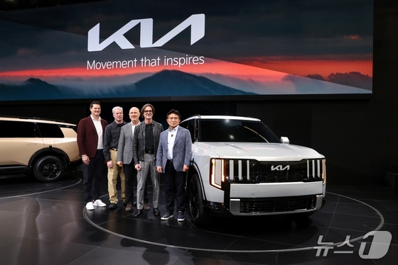 형 텔루라이드 앞에서 기아 북미권역 관계자들이 기념촬영을 하고 있다. 왼쪽부터 기아 미국법인 영업담당 상무 에릭 왓슨, 기아 미국법인 마케팅담당 상무 러셀 와거, 기아 …