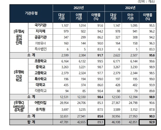 최근 2개년 사회적 장애인식개선교육 이행률. 보건복지부 제공지난해 국가·공공기관 등의 장애인식 개선교육 이행률이 3년 만에 반등한 것으로 나타났…
