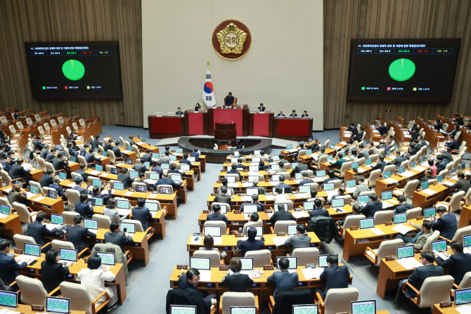 지난 2일 국회 본회의에서 석유화학산업의 경쟁력 강화 및 지원에 관한 특별법안(대안)이 가결되고 있다. (사진=연합뉴스) [이데일리 김기덕 기자] 벼랑 끝 위기에 몰린 석유화학산업