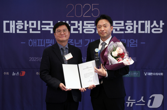 3일 서울 중구 롯데호텔에서 열린 2025대한민국 반려동물 문화대상에서 채원배 뉴스1 전무가 국회 농림축산식품해양수산위원회 위원장 상을 서울특별시수의사회에게 전달하고 있…