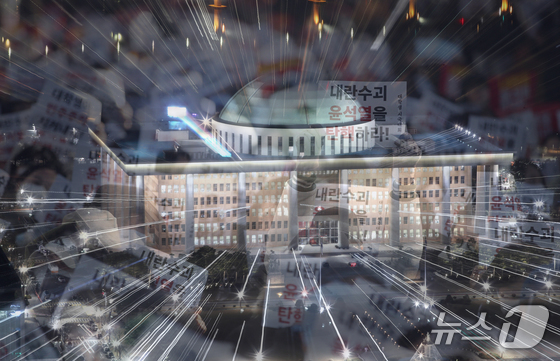 비상계엄 사태 1년을 맞아 오는 3일 국회 일대에서 ‘시민대행진’이 열릴 예정이다. 사진은 국회 야경에 비상계엄 윤석열 전 대통령 탄핵 집회 레이어 합성. 2025.12…