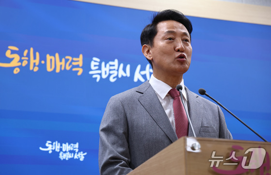오세훈 서울시장이 1일 오후 서울시청 브리핑실에서 김건희 특검이 오 시장을 '명태균 여론조사비' 대납 혐의로 기소한 것과 관련해 입장을 밝히고 있다. 2025.12.1/…