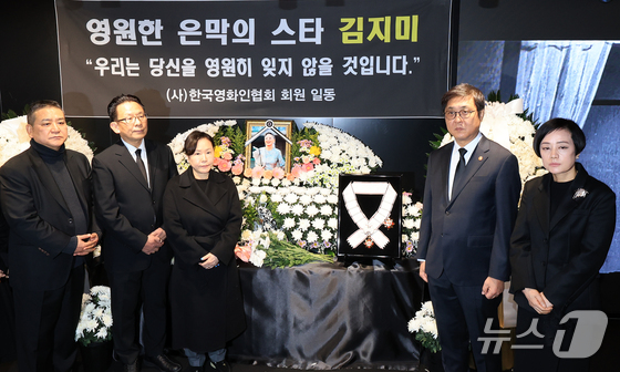 최휘영 문화체육관광부 장관오른쪽 두 번째이 14일 서울 중구 서울영화센터에 마련된 고 김지미 배우의 추모공간을 찾아 금관문화훈장을 전달한 뒤 유가족 및…