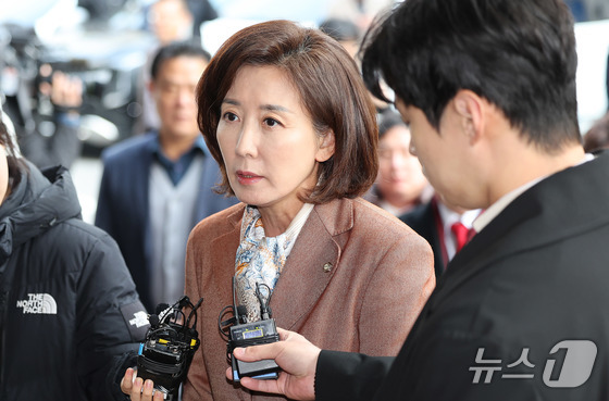 나경원 국민의힘 의원이 20일 서울 양천구 남부지법에서 열린 '자유한국당 패스트트랙신속처리안건 충돌 사건' 1심 선고 공판에 출석하고 있다. 2025.…