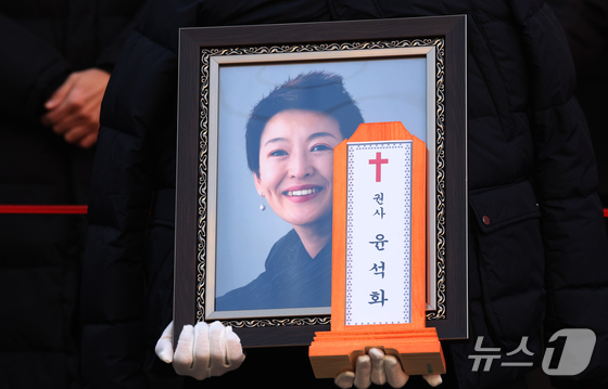 21일 서울 종로구 대학로 설치극장 정미소현 한예극장에서 열린 故 윤석화 배우 노제에서 영정이 운구되고 있다. 2025.12.21/뉴스1 …