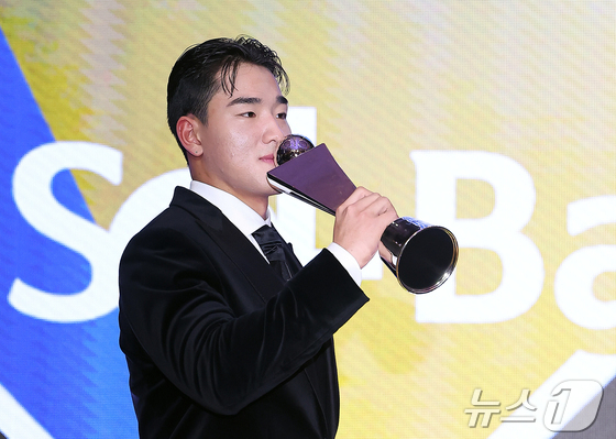 24일 오후 서울 송파구 잠실 롯데월드 호텔에서 열린 프로야구 '2025 신한 SOL 뱅크 KBO리그' 시상식에서 신인상을 수상한 KT 안현민이 기념 촬영을 하고 있다.…