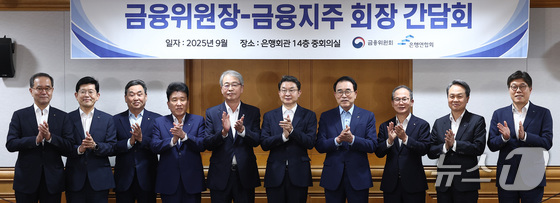 이억원 금융위원장가운데이 지난 9월 서울 중구 은행연합회에서 열린 금융위원장·금융지주 회장 간담회에서 금융지주 회장들과 기념촬영을 하고 있다. 왼쪽부터…