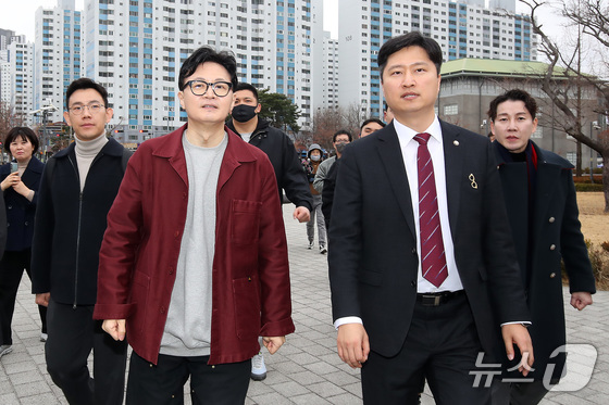 한동훈 전 국민의힘 대표왼쪽와 우재준 국민의힘대구 북구갑 의원이 지난 2월 26일 오후 대구 북구 삼성창조캠퍼스를 찾아 지역 소상공…